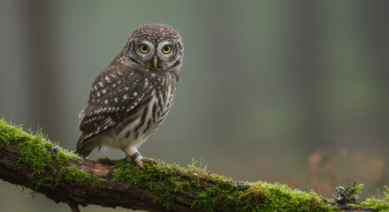 A spotted owlet sits on a mossy branch in a foggy forest.