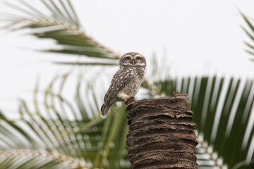 Spotted owlet sitting on a dead coconut tree stump