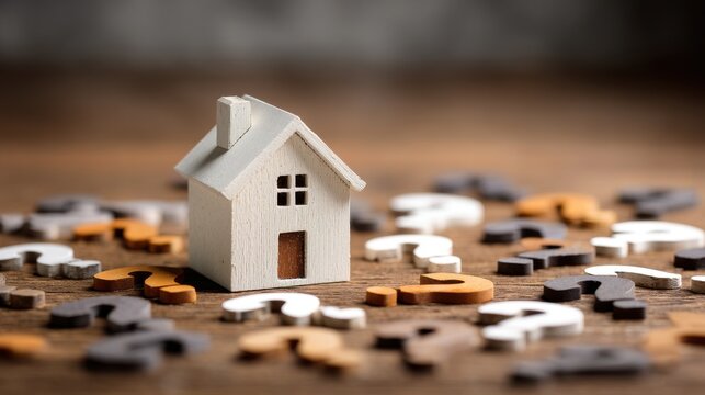 A 4K photo of simple house model surrounded by question marks, symbolizing uncertainty in home ownership decisions and property questions.