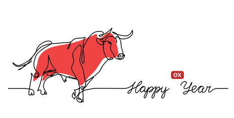 Happy ox Year simple vector banner, background. Chinese new year 2021 concept with red cow, bull. One continuous line drawing with text Happy ox Year.