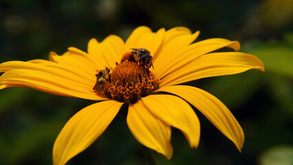 Close-up of a honey bee and an assassin bug sharing the yellow flower on a oxeye sunflower plant with a blurred background.