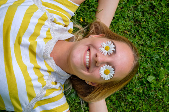 Close-up of smiling woman with oxeye daisies on eyes lying over grassy land in park