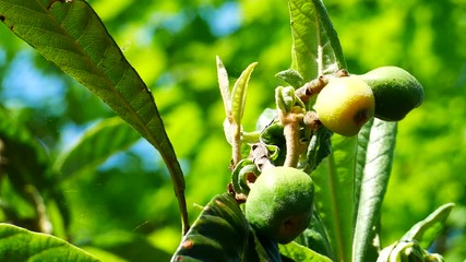 Loquat fruits (Eriobotrya japonica) on tree. This ancient fruit rich in vitamins, minerals and anti-oxidants, is grown in Japan for the past 1,000 years.