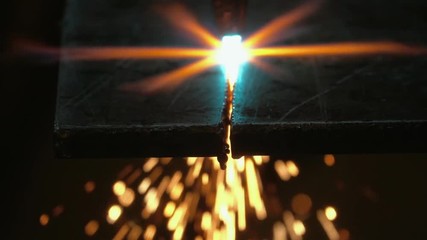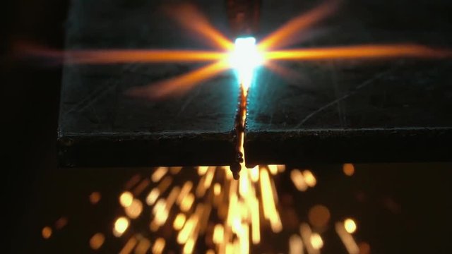 Oxyacetylene cutting through steel, torch burning and sparks flying