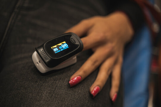 A woman's hand with long, red-painted nails using an oximeter to measure her pulse, oxygenation in first aid.