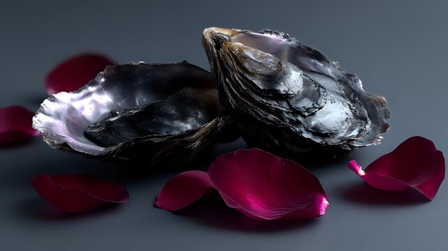 Fresh oyster shells on dark background with scattered deep red rose petals creating romantic mood for Valentine's day menu design or seafood restaurant promotion.