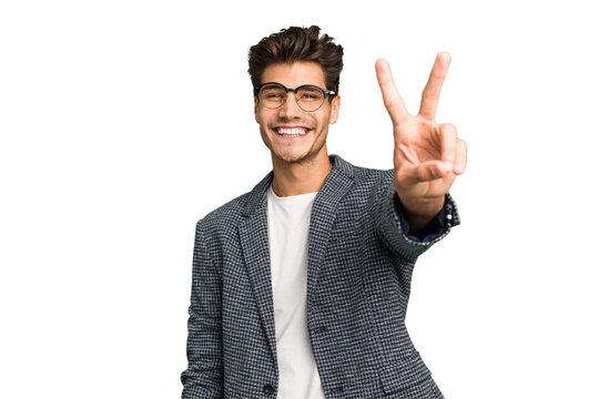 Young caucasian handsome man isolated joyful and carefree showing a peace symbol with fingers.