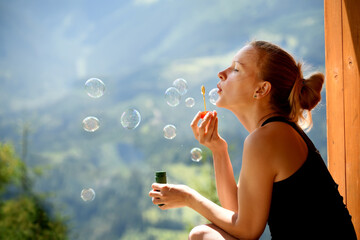 A girl in a calm mood blows bubbles overlooking the mountain landscape.