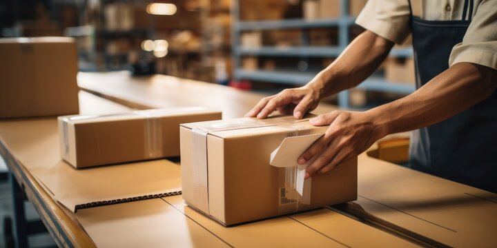 Festive cardboard box topped with a Santa hat sits ready for holiday shipping in a bustling warehouse