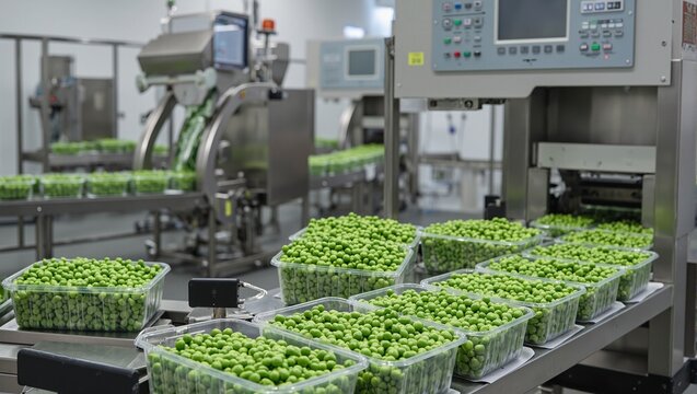 State of the art vegetable processing plant sorting and packaging fresh green peas with advanced machinery and efficient production line