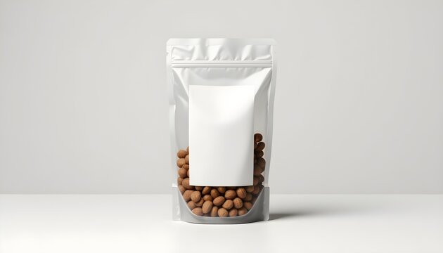 Clear pouch with kibble, minimalistic pet food packaging mockup design.