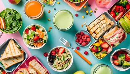 Healthy school meal, back to school concept. Children packed lunch box with balanced diet snack food - yogurt, cereal toast sandwich, apple, fresh vegetable salad, high-colored bright background