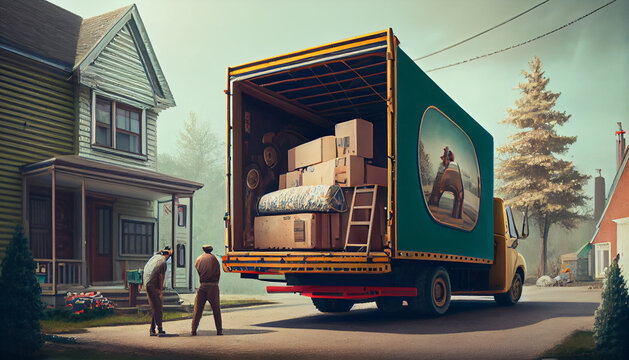 Relocation moving truck on street near by new house