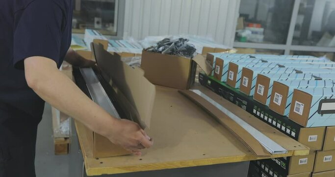 Women packer put the goods in the boxes in factory