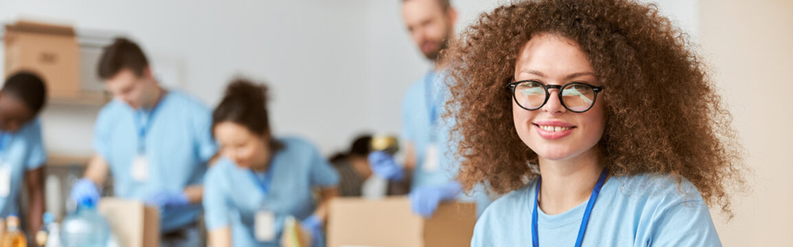 Attractive young woman, volunteer in blue uniform using tablet pc and smiling at camera while sitting indoors. Team sorting, packing items in the background