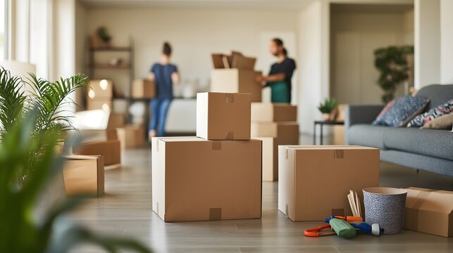 Smiling couple surrounded by boxes symbolizes new beginnings and home