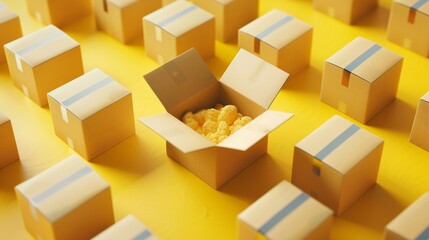 Open cardboard box with soft padding between closed boxes on yellow background. generative ai
