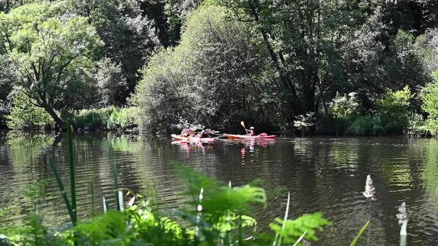 Group of kayakers enjoying adventure on serene river