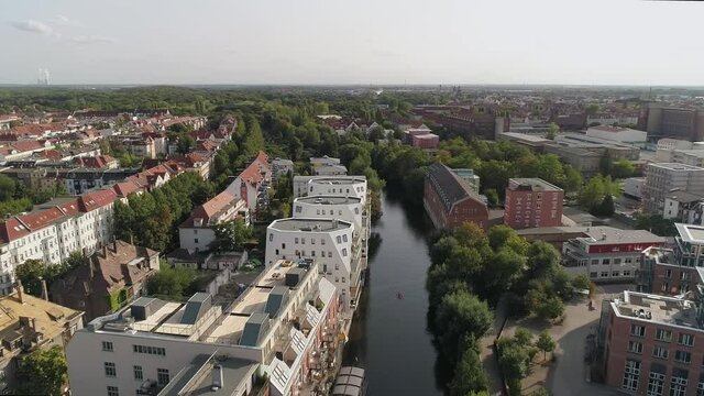 Flight along the white elster in Leipzig. New houses on the shore. View towards the park and Lake Cospuden.