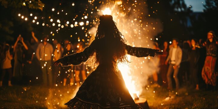 Woman dancing around bonfire at night with people around. Summer Solstice Day, Midsummer, Litha, Ivan Kupala celebration. Slavic pagan holiday. Wiccan ritual, witchcore aesthetics.