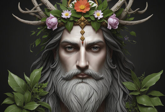 Divine representation of a pagan deity adorned with a botanical crown against a dark backdrop