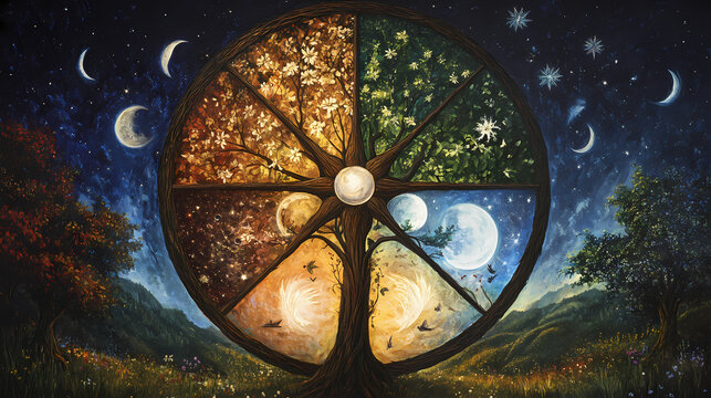 Wheel of the year nature's cycle wicca, paganism religion spiritual symbol. Chiaroscuro Contrast. Illustration