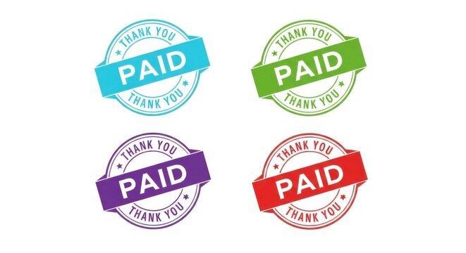 Four colorful circular stamps with the text paid and thank you on a white background