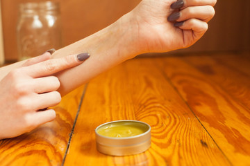 Female lady with nice finger nails rubbing massaging all natural organic home made self care cannabis CBD balm from tin with great natural weed smell to body skin muscle ache hand pain relief