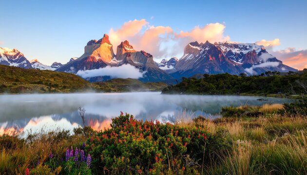 Torres del Paine National Park with snow capped mountains (Cordillera Paine) at sunrise. Chile