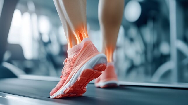 240805 83. Close-up of person massaging painful calf in modern gym setting. Inflamed gastrocnemius fascia due to overuse syndrome and excessive incline treadmill running. Anatomical visualization on
