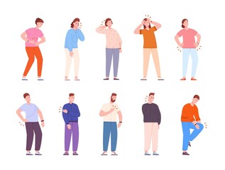 People physical hurt. Woman disease illness leg neck back, person types pain painfulness stomach, ill girl physical injured, ache joints headache, flat splendid vector illustration