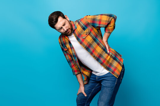 Photo portrait of nice young guy touch back need painkiller wear trendy plaid garment isolated on blue color background