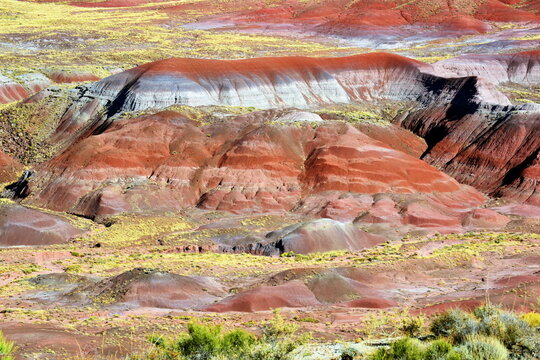 Mountains in Arizona's Painted Desert with colorful geologic bands.
