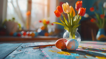 A joyful Easter egg painting activity with children decorating eggs with vibrant paints and stickers, styled with a festive table setup