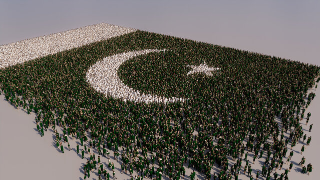 Aerial view of a Crowd of People, coming together to form the Flag of Pakistan. Pakistani Banner on White Background.