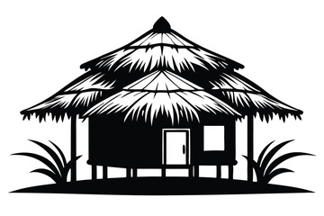 Tropical Hut Silhouette with Thatched Roof, Open Door, and Grass Detail Illustration