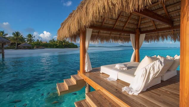 Featuring overwater thatched palapa with cushioned daybed resting on deck at resort, fish below