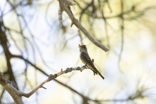 A Western Wood Peewee turns its head and sings as it perches on a pine branch in a shady forest with a background of out of focus pale green and blue in Southern Ut. USA on a summer day.