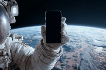 Astronaut in space holding a smartphone with blank screen against earth background   sci fi concept