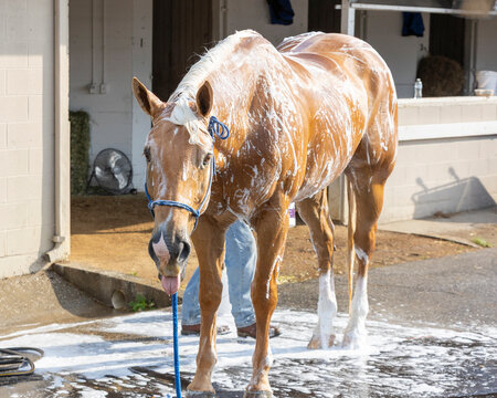 A palomino race track pony getting a bath in front of a barn with his tongue out.