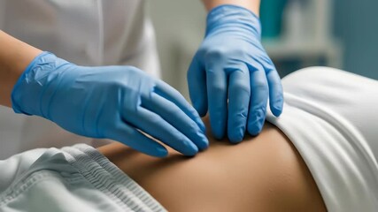Medical examination: closeup of doctor performing abdominal palpation for health checkup