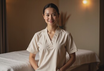 Cheerful Asian Female Dog Groomer Smiling at Camera While Grooming a Dog in a Professional Setting