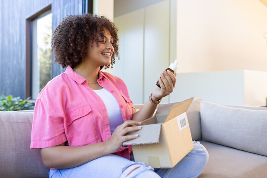Young woman in beige outfit holding skincare gift set in cosmetics store, surrounded by elegant product displays, showcasing beauty and self-care concept with copy space