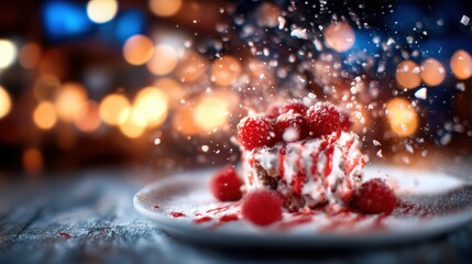 A tempting dessert, beautifully garnished with fresh raspberries and whipped cream, presents an inviting delight, tantalizing the senses with its rich flavors and aesthetic appeal.