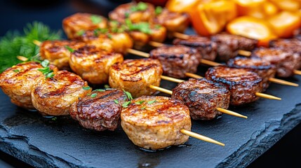 Culinary Skewers: An array of appetizing skewers, each laden with expertly grilled food, presented on a dark platter, tantalizing the senses and inviting indulgence.