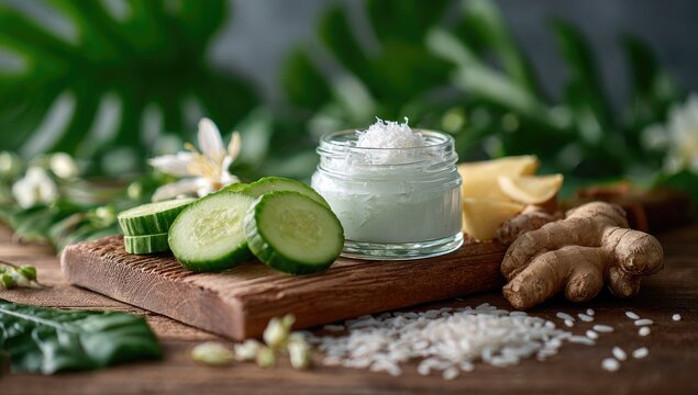 Spa skincare cream with cucumber, ginger, and rice