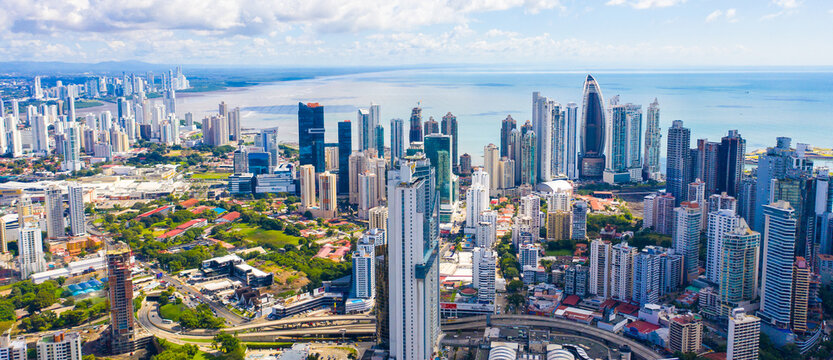 Aerial view of Panama´s  Skyline showing La Cinta Costera Boulevard
