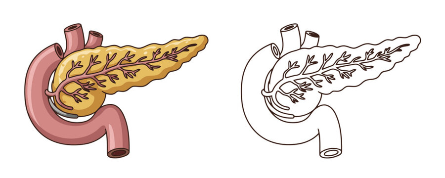 Medical illustration showing the human pancreas and duodenum in two styles: a colored version and a black and white line art outline on white