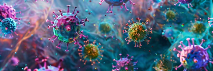 Colorful Viruses under microscope, Dangerous influenza or coronavirus cells for background
