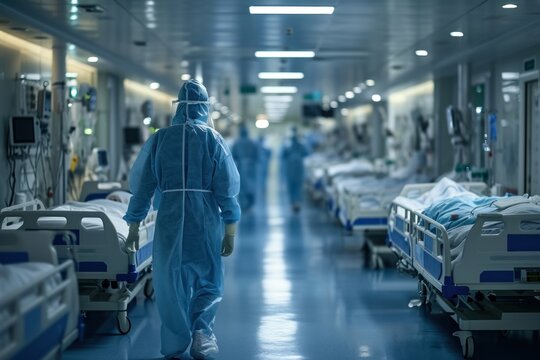 Healthcare worker in full protective suit stands in an empty hospital ward, ready to assist patients during a pandemic or outbreak. Vigilance and care.